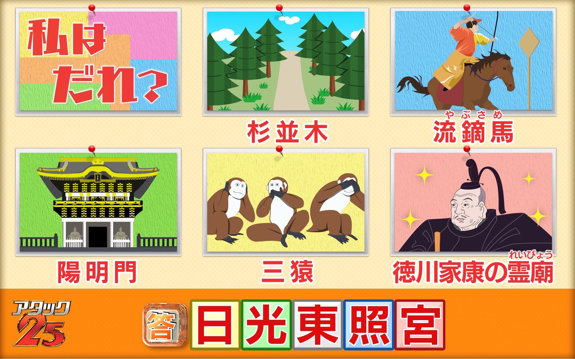 パネルクイズ アタック25 No Twitter アタック25 イラストクイズ 答え わたしの名前は 日光東照宮 でした 豪華な彫刻が特徴的な陽明門は ぜひ一度は見ておきたいですよね 次回もお楽しみに アタック25 イラストクイズ 谷原章介 クイズ